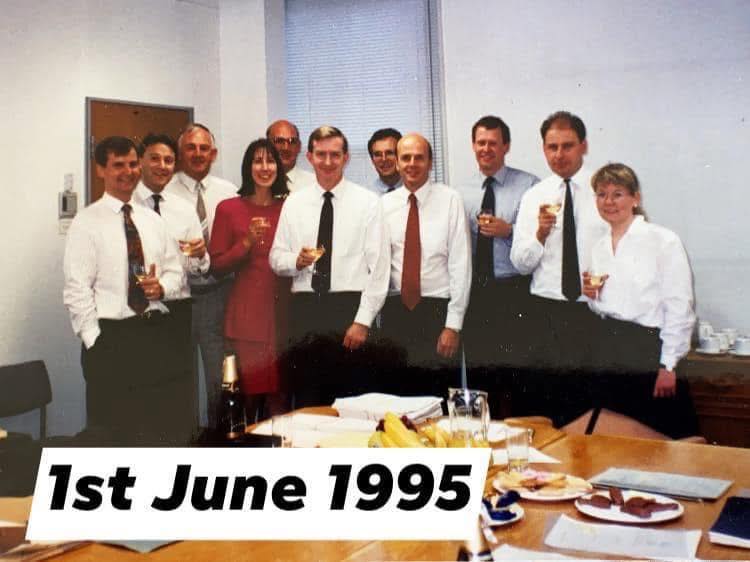 Image taken at the time of the Marsh family’s acquisition of L H Woodhouse. Pictured are: Robert Woodhouse, Adrienne Marsh (wearing red), Michael Woodhouse (standing behind Adrienne), Tony Marsh, Michael Woodhouse (seated at the front), and Stephen Kitts (second from right – solicitor for the Woodhouse family, Eversheds Nottingham).
